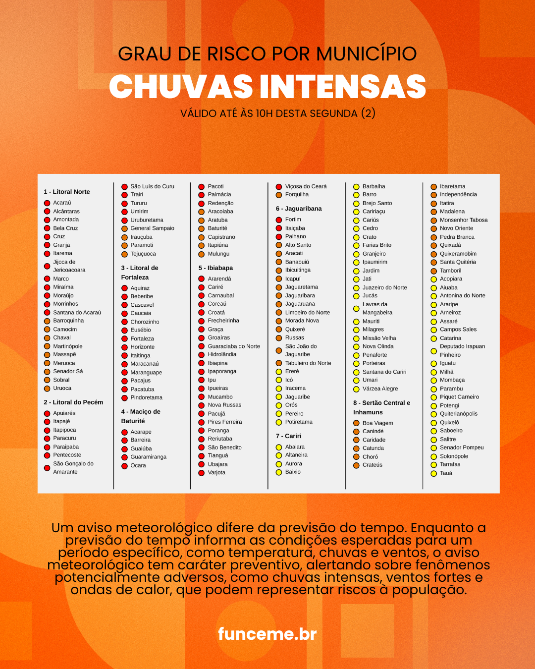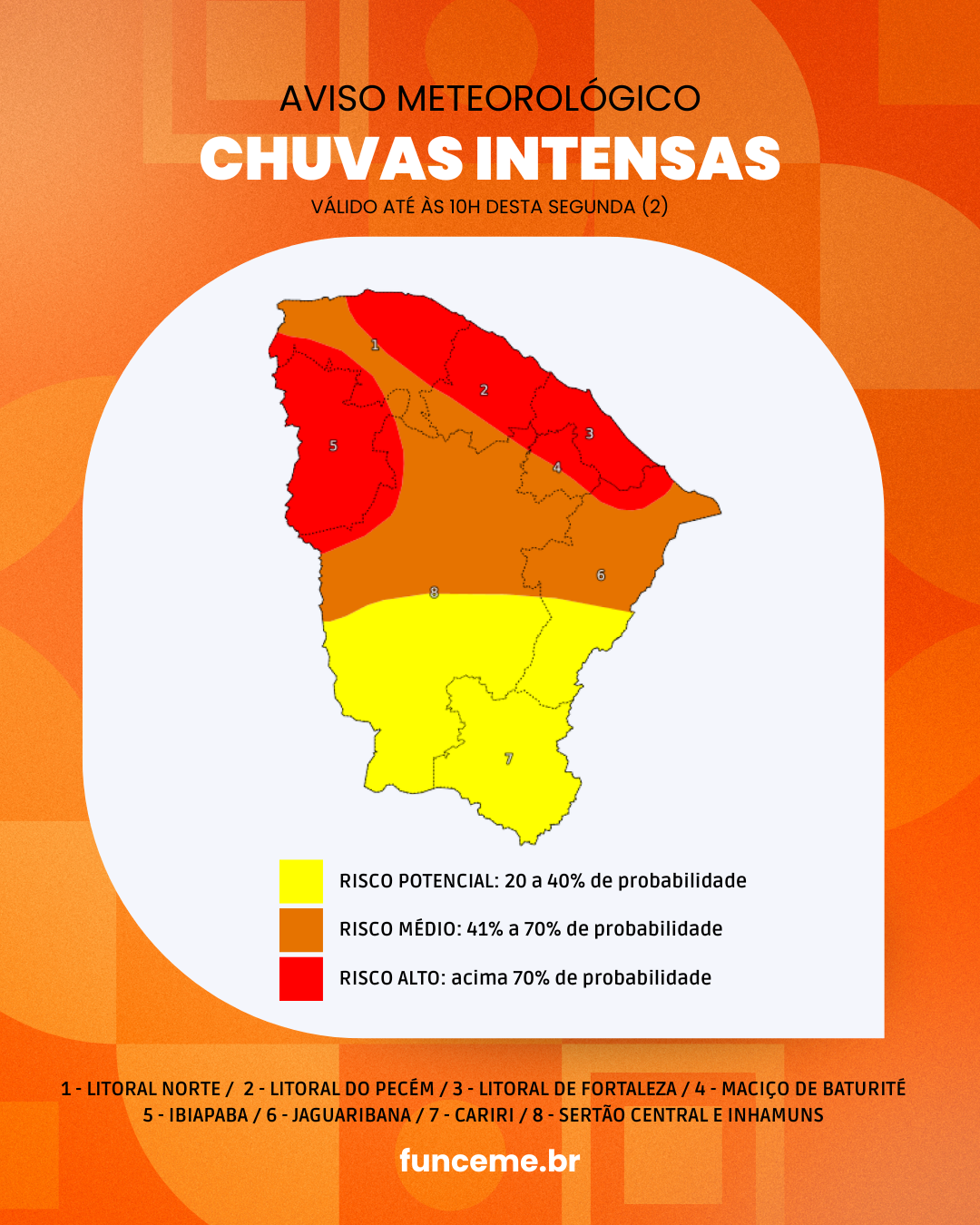 Diante do cenário favorável para acumualdos mais expressivos, a Funceme reforçou, em sua previsão do tempo, a emissão de uma aviso meterológico, em que indica cerca de 60 municípios com alto risco.