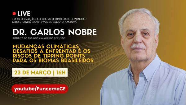 Em celebração ao Dia Meteorológico Mundial 2026, a Fundação Cearense de Meteorologia e Recursos Hídricos (Funceme) realiza, nesta segunda-feira (23), uma palestra com o renomado cientista Carlos Nobre, pesquisador do Instituto de Estudos Avançados da Universidade de São Paulo.