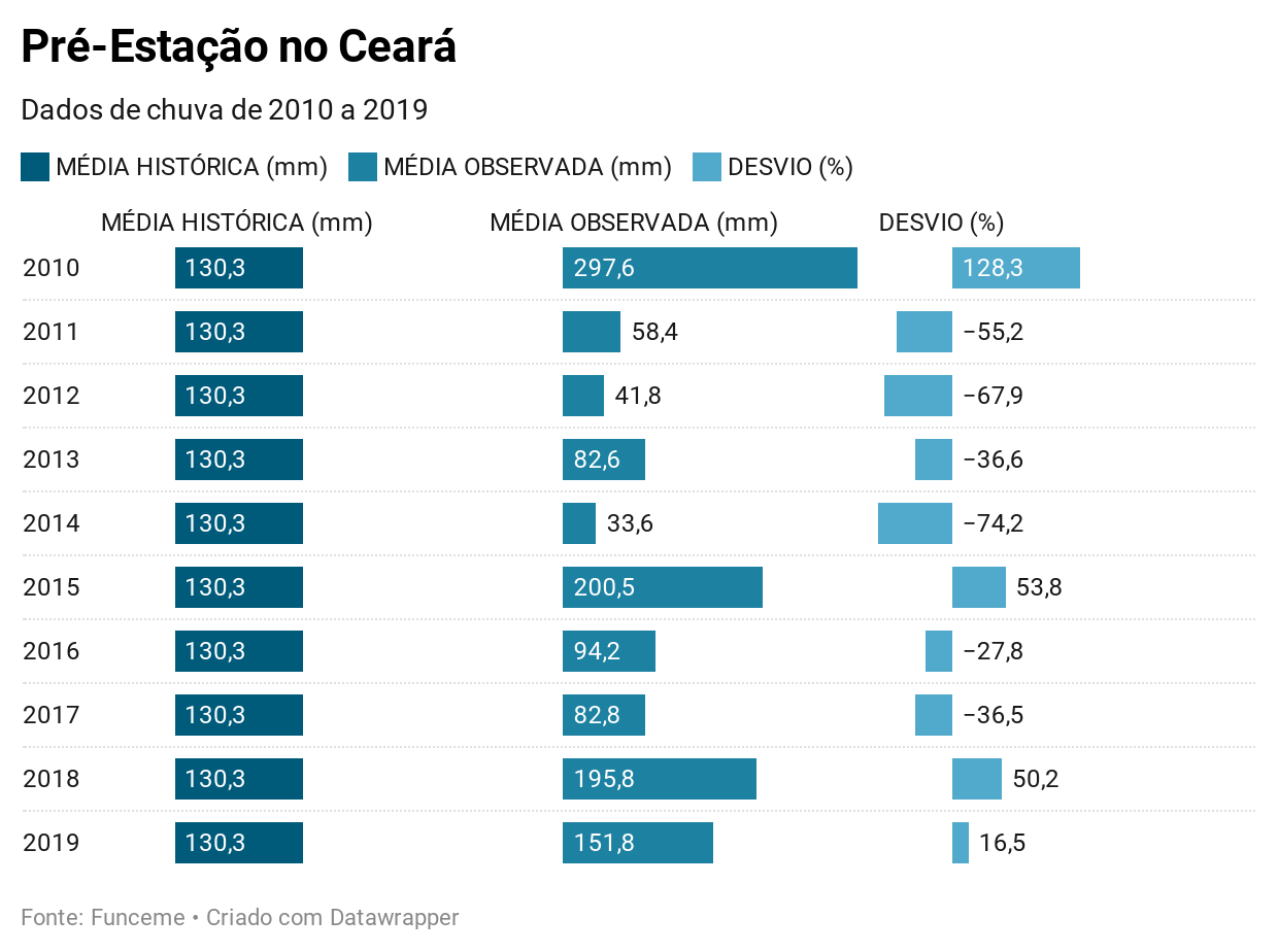 De acordo com dados da Fundação Cearense de Meteorologia e Recursos Hídricos (Funceme), a média para o bimestre é de 130,3 milímetros, sendo 31,6 mm correspondentes às chuvas em dezembro e 98,7 mm, em janeiro. A qualidade das precipitações nesta época não têm relação com o resultado dos meses seguintes.